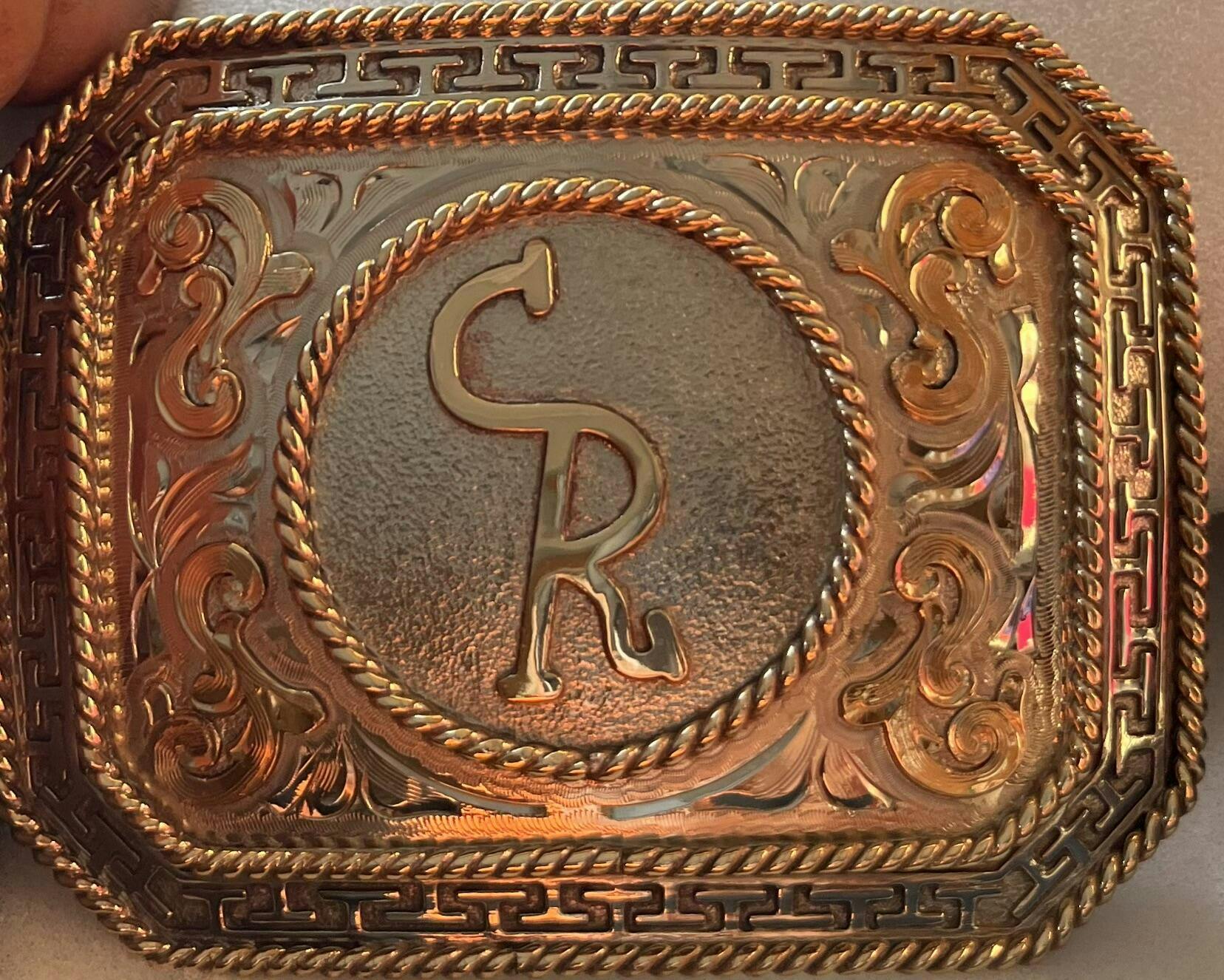 The Boss' Signature custom belt buckle is a timeless symbol of western craftsmanship. This handcrafted masterpiece features a german silver base with a hand-engraved background and a brushed finish center, exuding a classic and refined look.